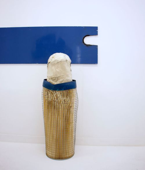 Textile, glue, metal wire, metal plate, paper, acrylics, rubber band,